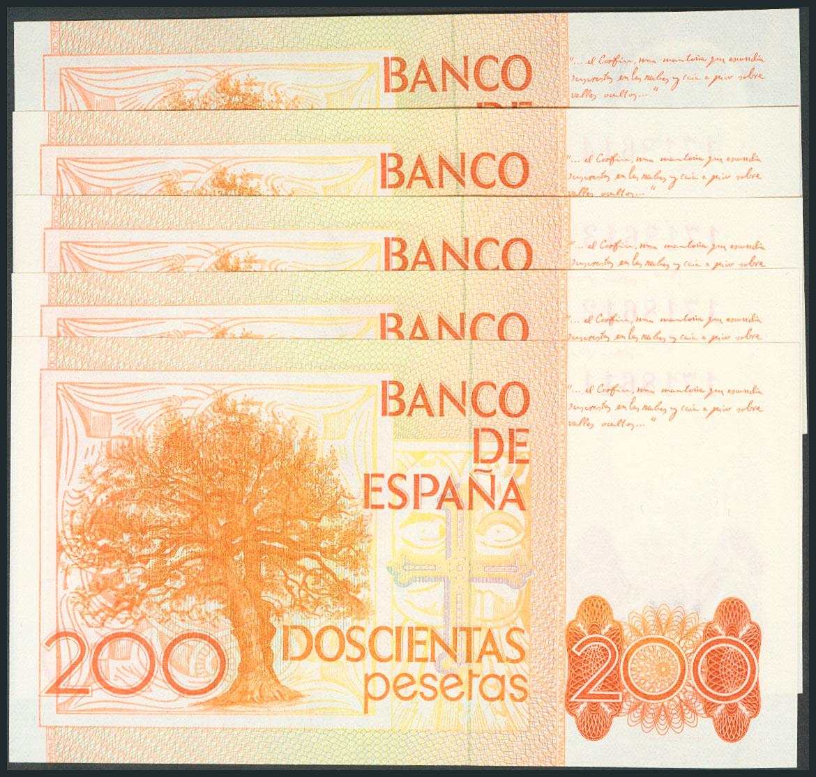 Conjunto de 5 billetes correlativos de 200 Pesetas emitidos el 16 de Septiembre de 1918, sin serie. (Edifil 2017: 480). SC.