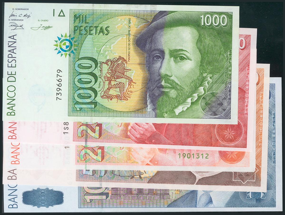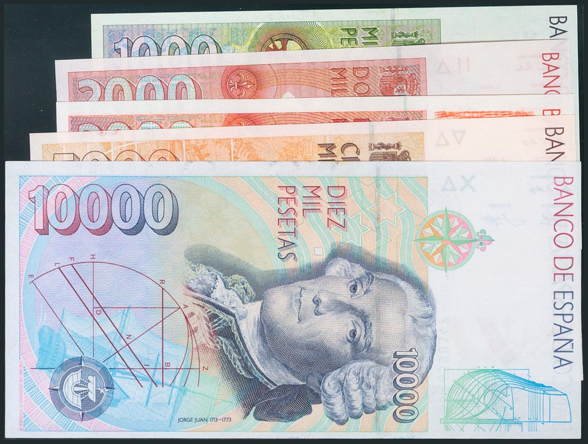 Serie completa de 5 billetes sin serie de 1000, 2000 (dos variantes), 5000 y 10000 Pesetas (Edifil 2017: 482/85). SC.