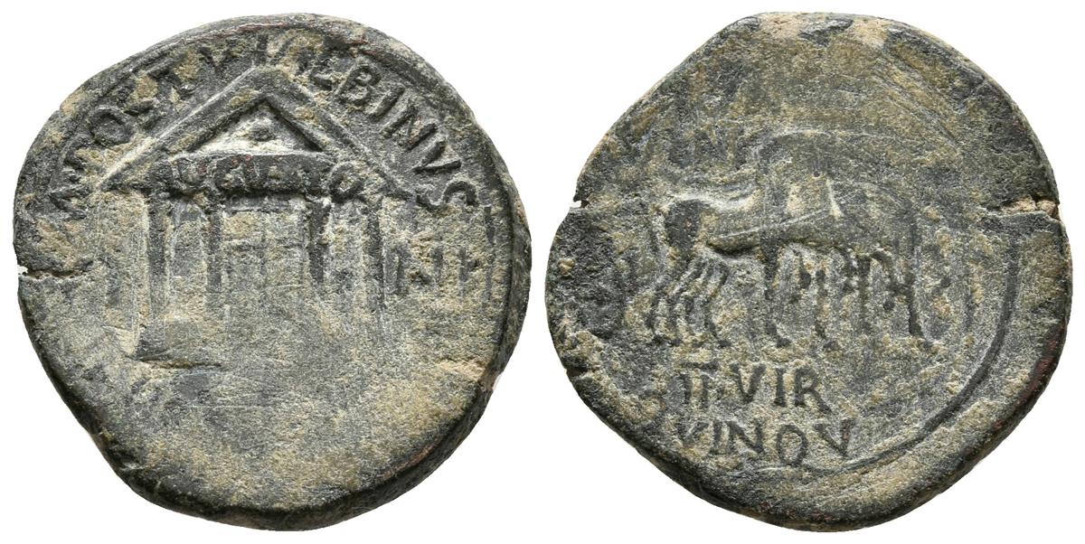 CARTAGONOVA. Semis. Epoca de Tiberio. 14-36 d.C. Cartagena (Murcia). A/ Templo tetrástilo. AVGVSTO VINK. M. POSTV ALBINVS II VIR. QVINQ. ITER. R/ Cuádriga a derecha, delante vexilo. P. TVRVLLIO V.I.N.K. II VIR. QVINQ. ITER. FAB-604. Ae. 5,67g. MBC-.