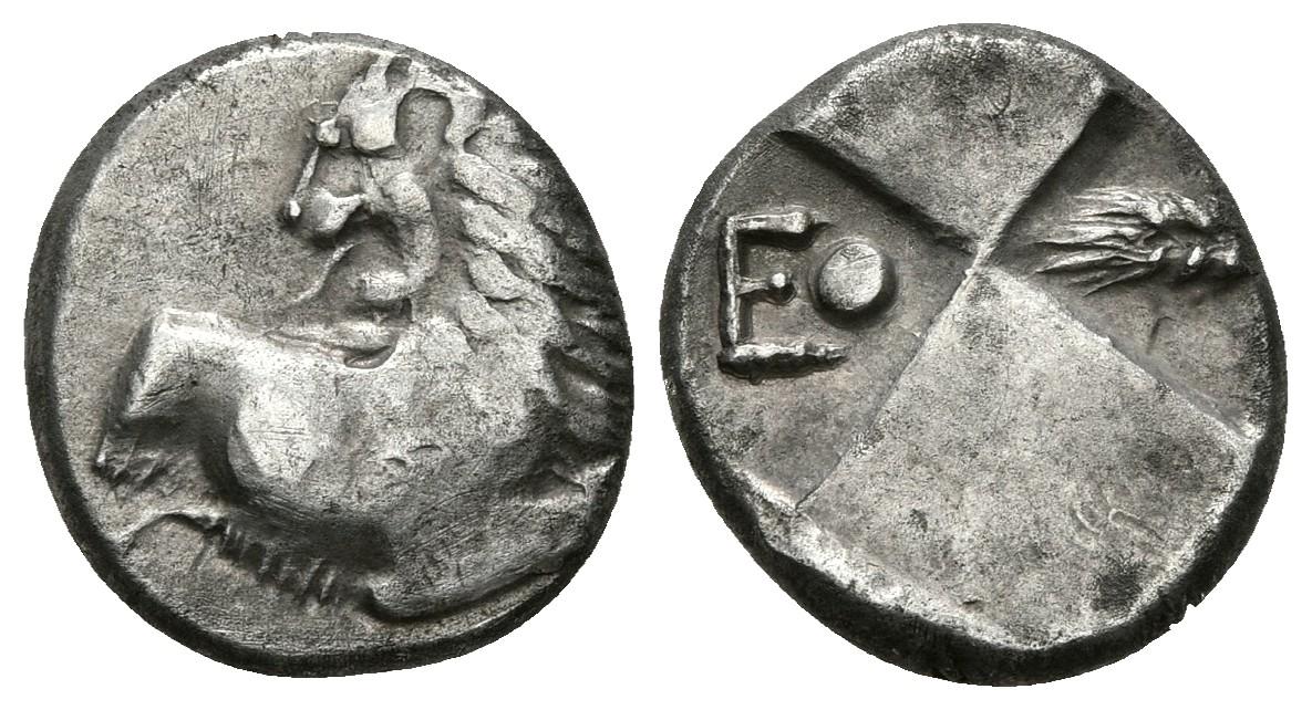 CHERSONESOS, Tracia. Hemidracma. 400-350 a.C. A/ Parte delantera de león a izquierda con cabeza vuelta. R/ Cuatro cuadros incusos, segundo cuartel E con punto y cuarto cuartel espiga. McClean 4101; Weber 2429. Ar. 2,28g. MBC.