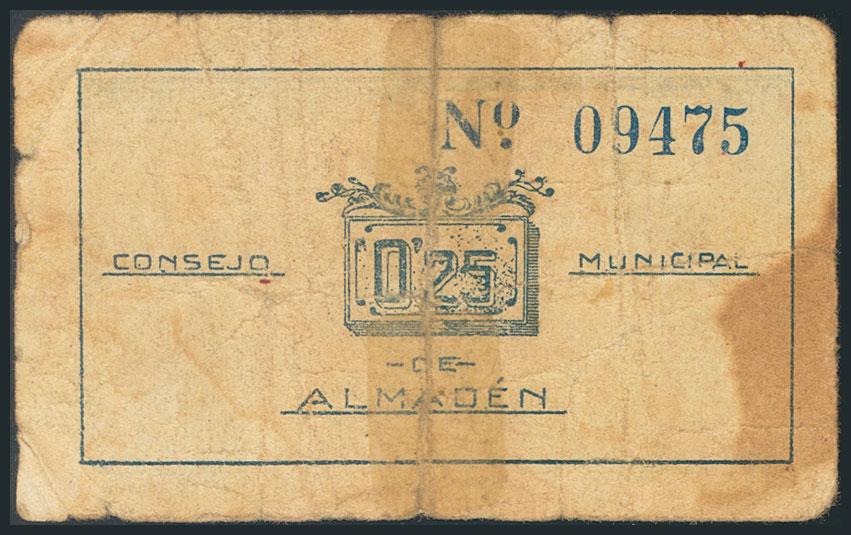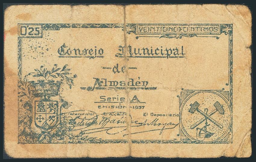 ALMADEN (CIUDAD REAL). 25 Céntimos. 1937. (González: 535). Inusual. RC.