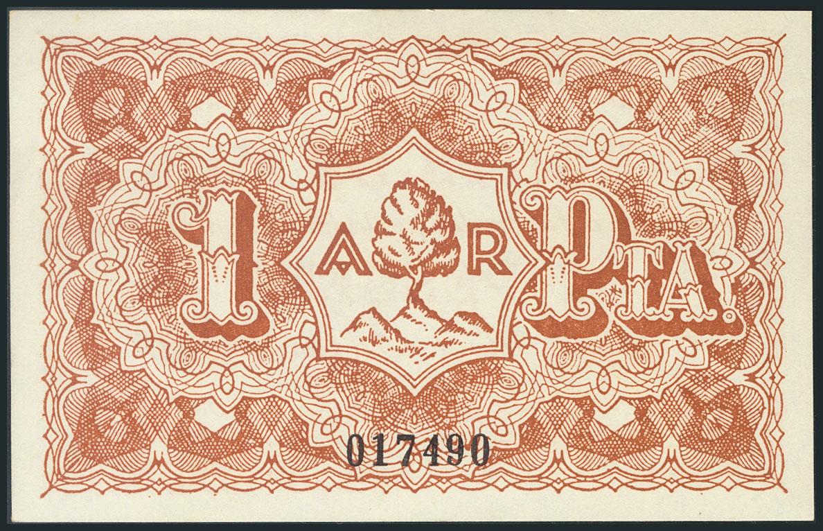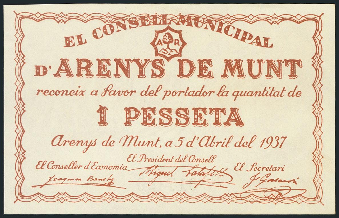 ARENYS (BARCELONA). 1 Peseta. 5 de Abril de 1937. SC.