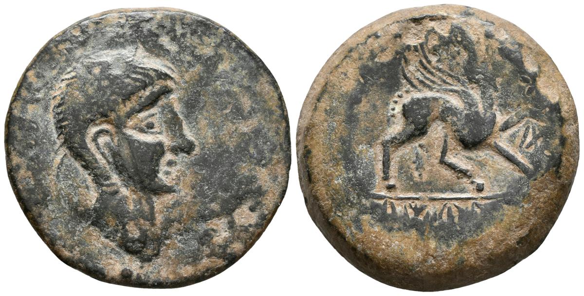 CASTULO. As. 180 a.C. Cazlona (Jaén) A/ Cabeza masculina diademada a derecha. R/ Esfinge avanzando a derecha, debajo KaSTiLO. Delante estrella y letra ibérica Co. FAB-697. Ae. 24,51g. MBC.