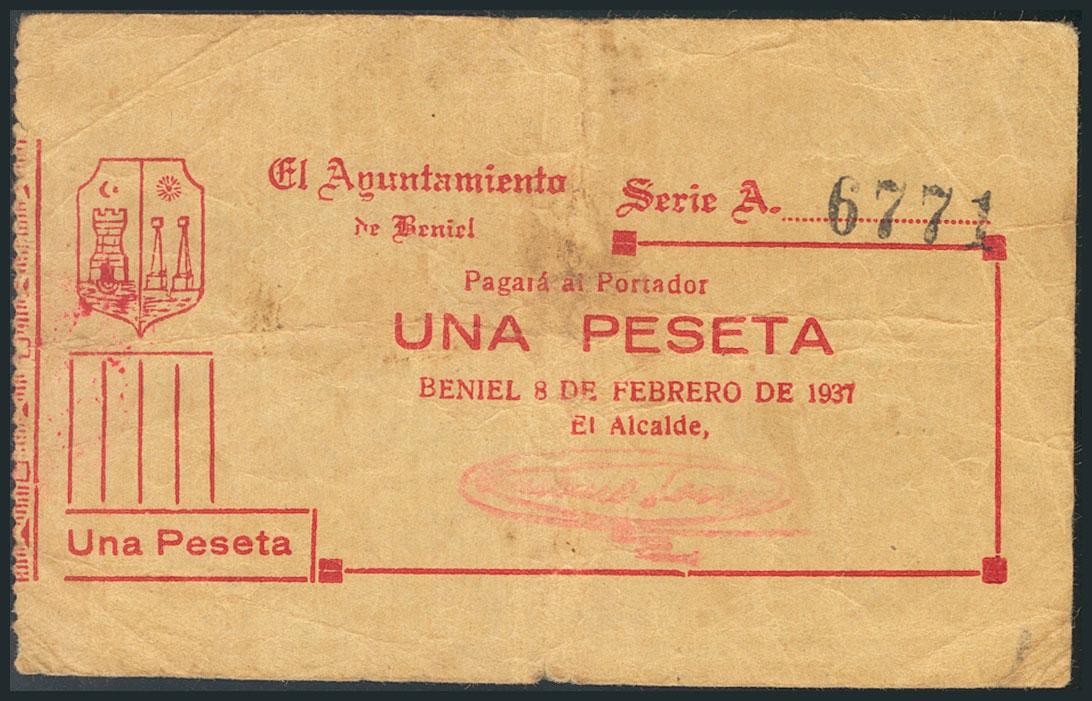 BENIEL (MURCIA). 1 Peseta. 8 de Febrero de 1937. Serie A. (González: 1098). Raro. BC.