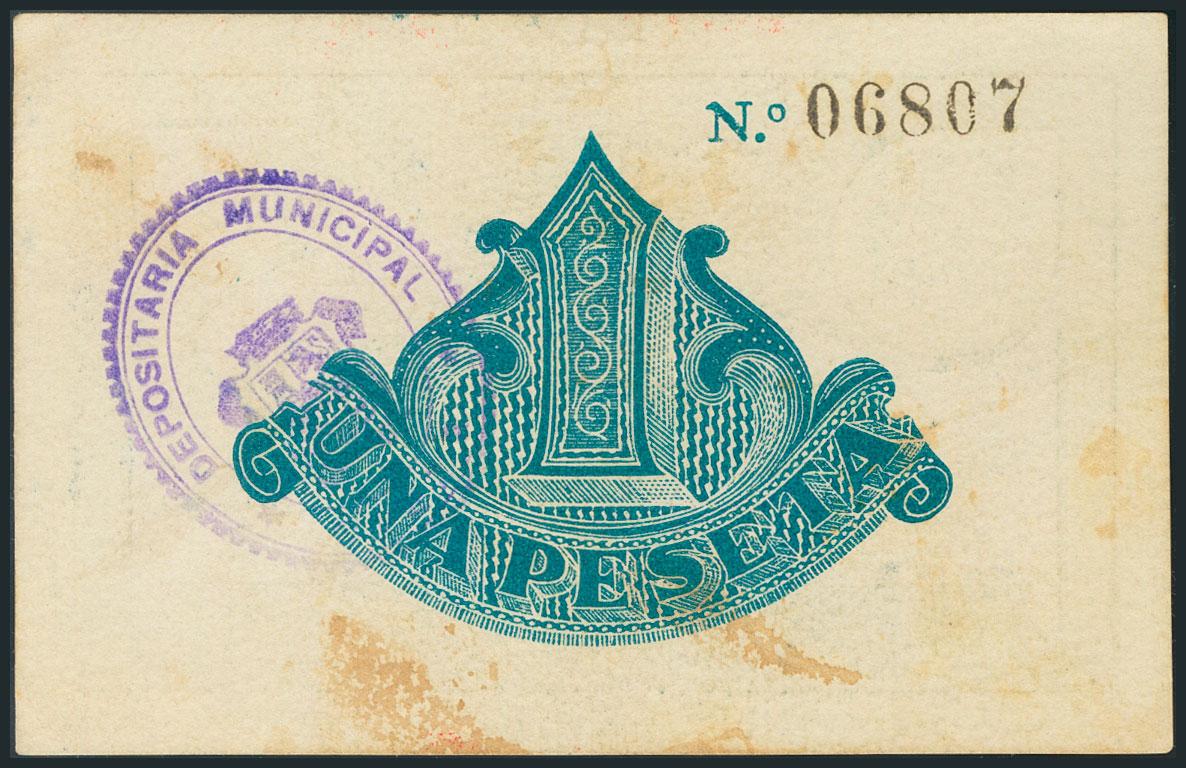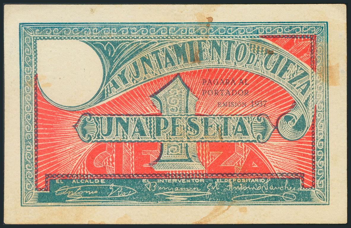 CIEZA (MURCIA). 1 Peseta. 1937. Variante color azul. (González: 1961b). BC.