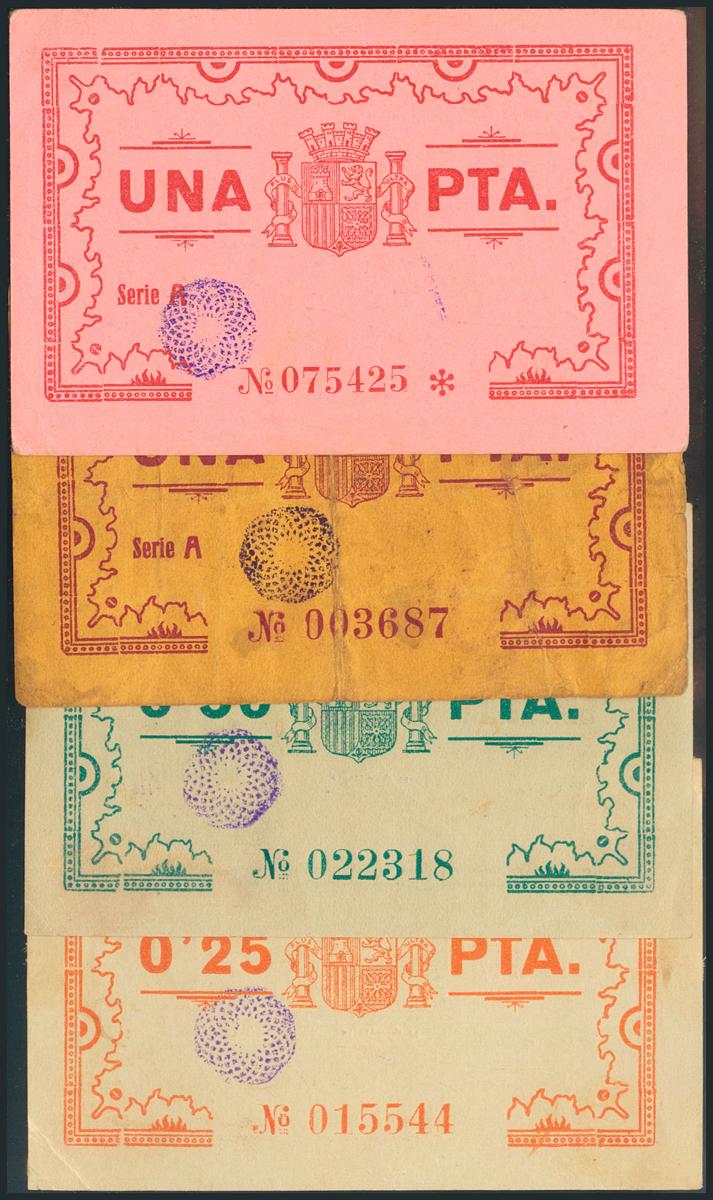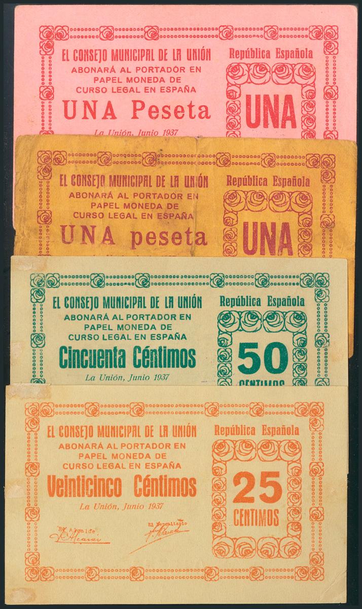 LA UNION (MURCIA). 25 Céntimos, 50 Céntimos y 1 Peseta papel naranja serie A y 1 Peseta papel rosa serie A. Junio de 1937 (González: 5219, 5221, 5224, 5225). MBC/BC.