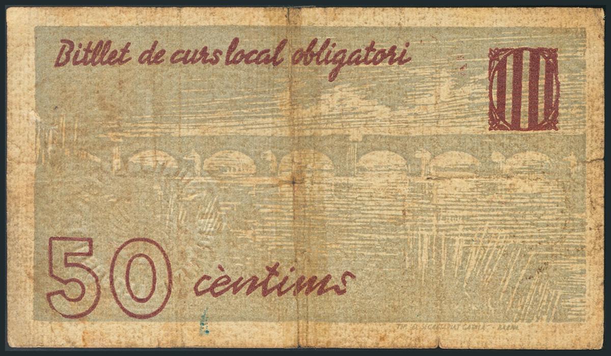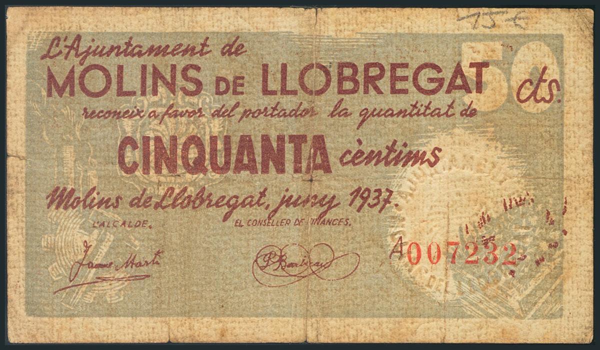MOLINS DE LLOBREGAT (BARCELONA). 50 Céntimos. Junio de 1937. BC-.