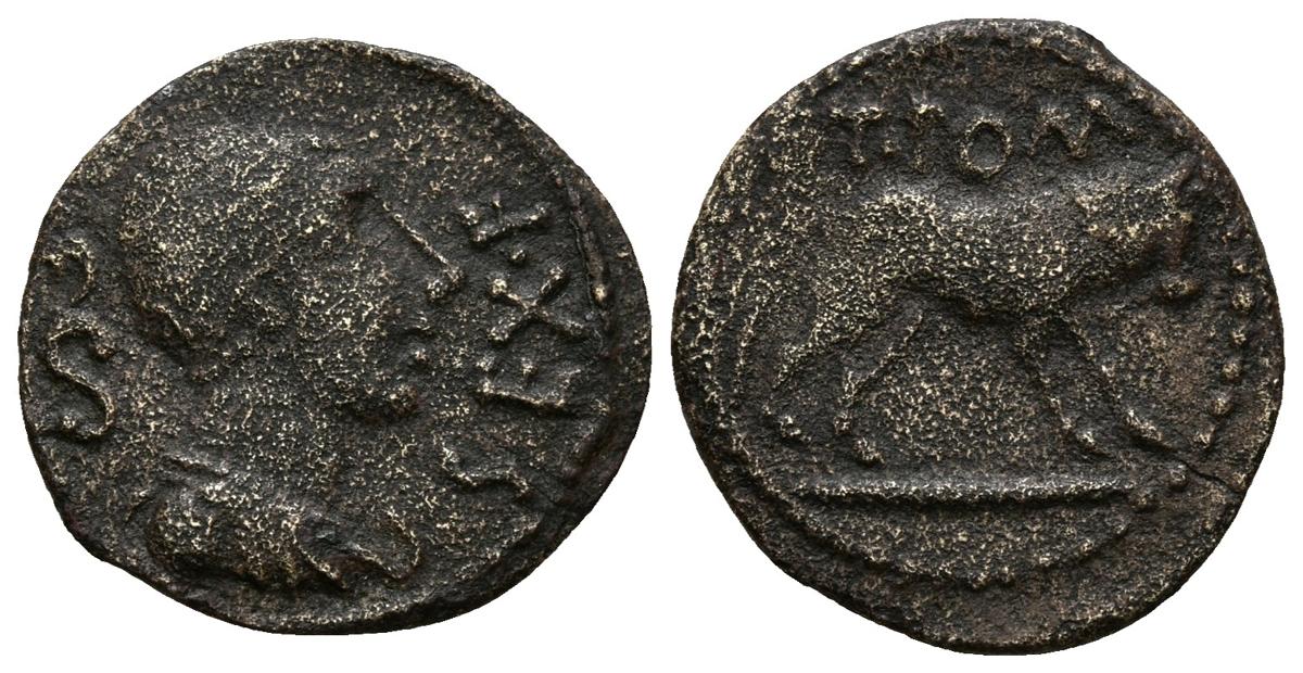 CAVARES, Galia. Ae17. Siglo I a.C. A/ Busto drapeado a derecha, delante SEX·F y detrás voluta en forma de S superada por pequeño creciente. R/ Toro avanzando a derecha, sobre el T·POM. D&T 3719; Scheers, S-M 40-43; CCCBM III 261-262; Depeyrot, NC I, 130.54 (this coin); De la Tour 4353; RPC I 507. Ae. 1,40g. MBC-. Rara.