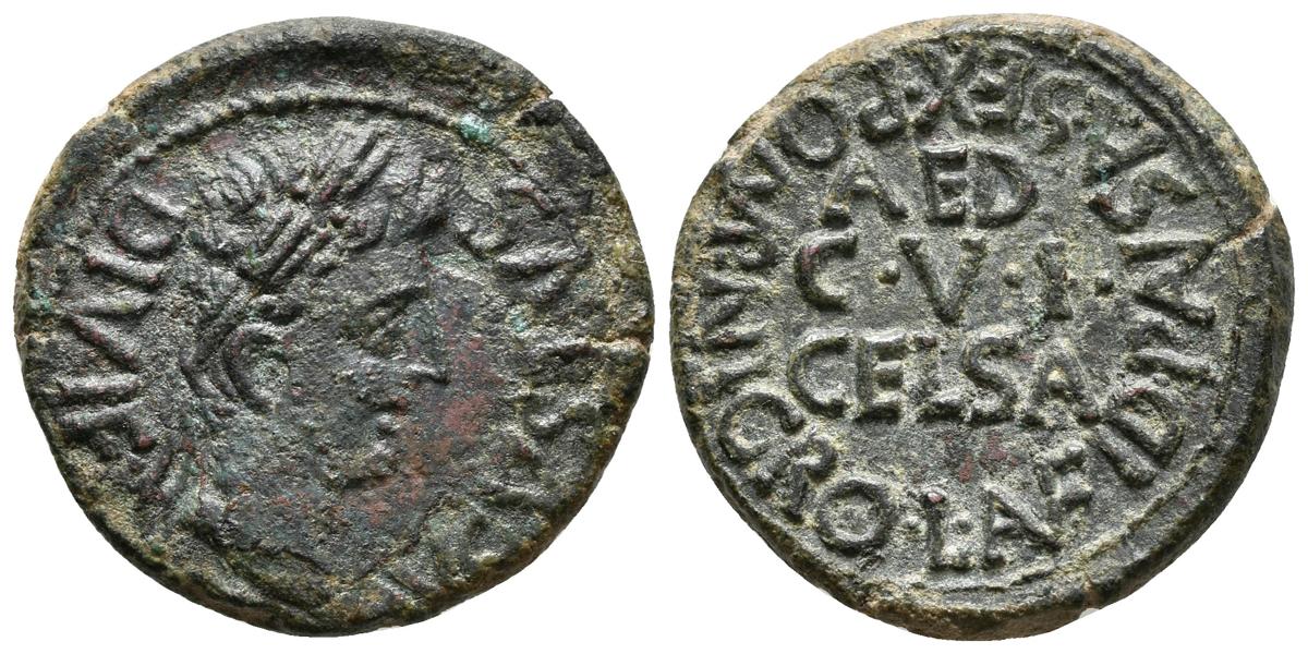 CELSA-KELSE. Semis. Epoca de Augusto. 27 a.C.-14 d.C. Velilla de Ebro (Zaragoza) A/ Cabeza laureada de Augusto a derecha. AVGVSTVS DIVI. F. R/ Leyenda central AED. C. VI CELSA, alrededor L. AVFID. PANSA. SEX. POMP. NIGRO. FAB-816. Ae. 6,55g. MBC+.