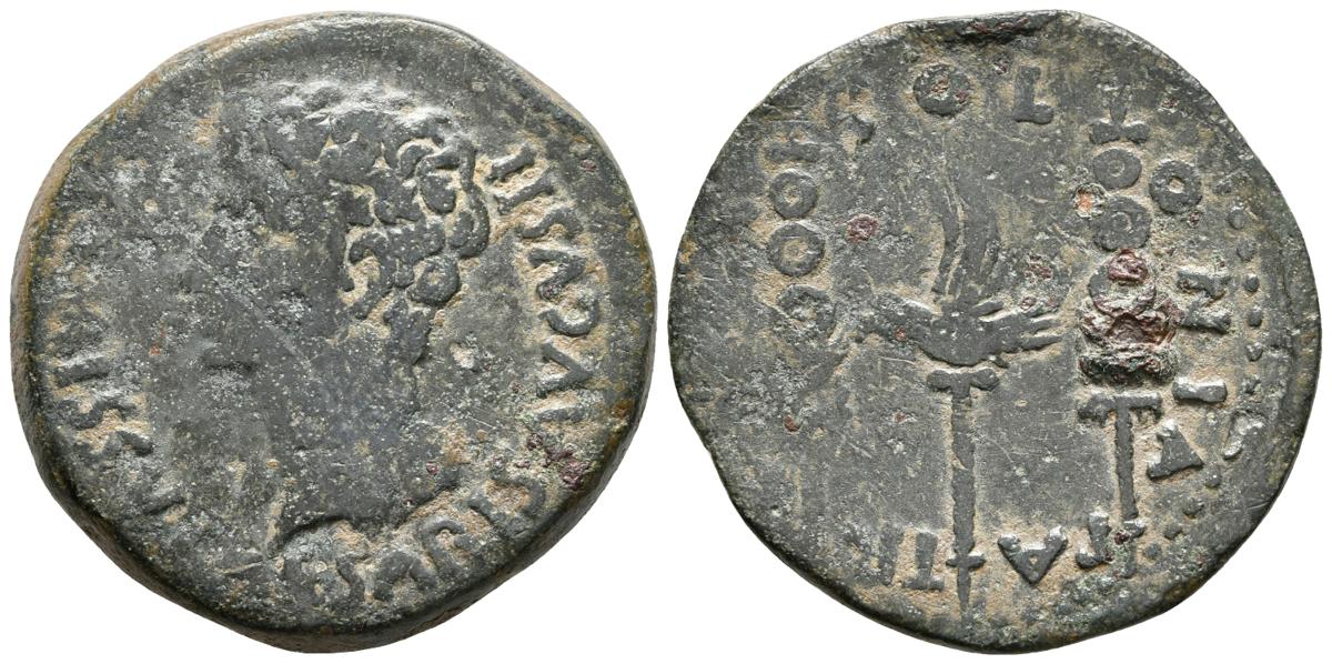 COLONIA PATRICIA. Dupondio. Epoca de Augusto. 27 a.C.-14 d.C. Córdoba. A/ Cabeza de Augusto a izquierda alrededor PERMISSV CAESARIS AVGVSTI. R/ Enseñas y águilas legionarias, alrededor COLONIA PATRICIA. FAB-1988. Ae. 18,39g. BC+/MBC-.