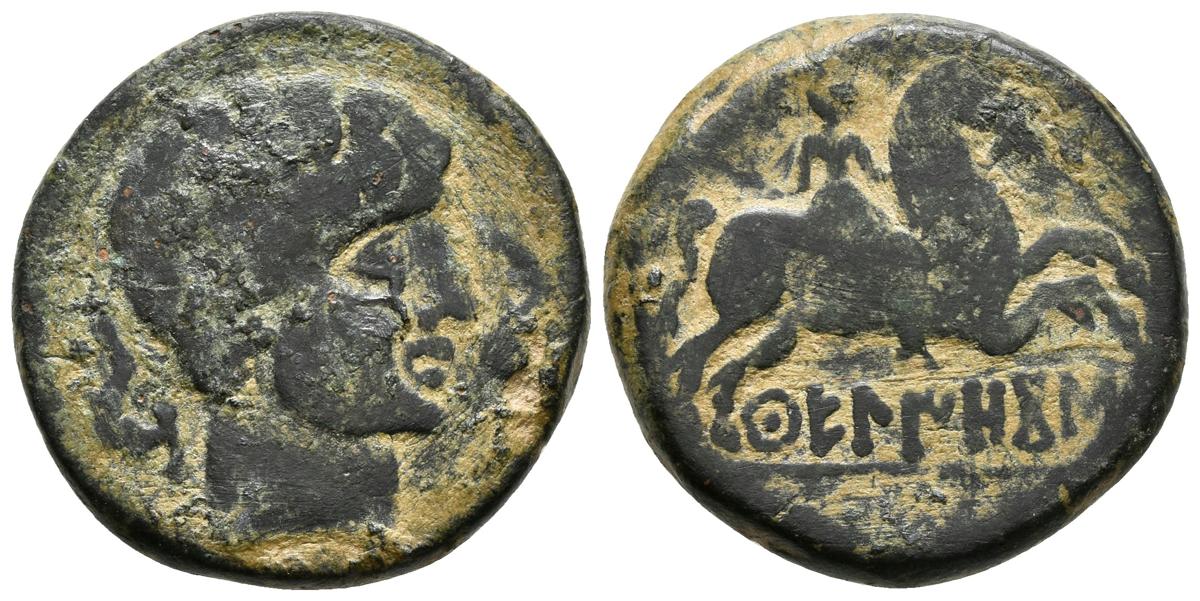 CUELIOCOS. As. 120-20 a.C. Zona alta del Ebro. A/ Cabeza sin barba a derecha entre delfines y letra ibérica Cu. R/ Jinete con palma a derecha, sobre línea CuELIOCoS. FAB-870. Ae. 10,39g. BC+.