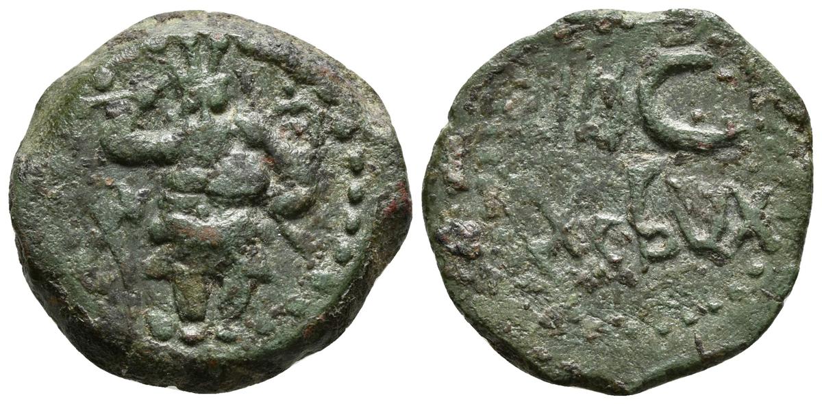 EBUSUS. Semis. 200-100 a.C. Ibiza (Islas Baleares). A/ Bes con maza y serpiente, a la izquierda letra fenicia Aleph. R/ Leyenda fenicia en dos líneas Ybsm y marca de valor L. FAB-946. Ae. 7,78g. MBC.