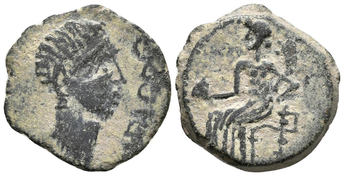 IRIPPO. As. 30 a.C. Cercanías de Sevilla. A/ Cabeza de ¿Octavio? a derecha, delante leyenda externa IRIPPO, alrededor láurea. R/ Deidad femenina sentada a derecha con piña y cornucopia rodeada de láurea. FAB-1581. Ae. 5,26g. MBC/MBC+.