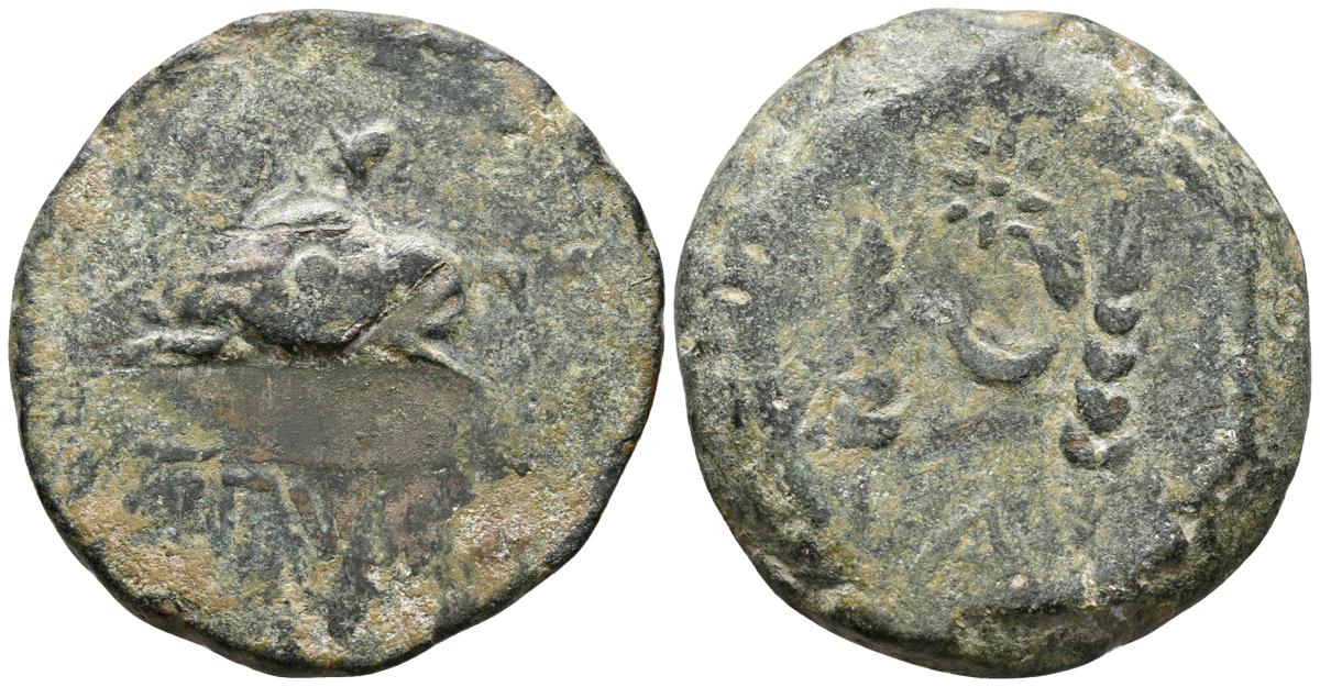 ITUCI. Dupondio. 150-50 a.C. Tejada la Vieja (Sevilla). A/ Jinete con rodela a izquierda, debajo ITVCI. R/ Dos espigas entre ellas creciente y A. FAB-1599. Ae. 32,63g. Golpe en anverso. MBC-. Rara.