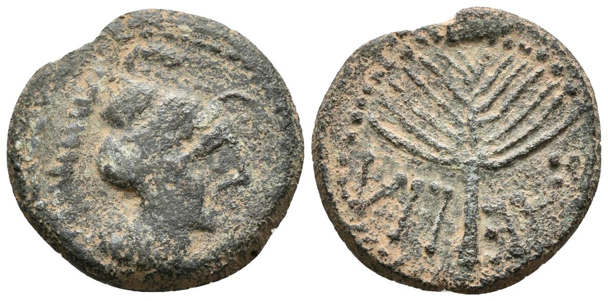 LAELIA. Semis. 50-20 a.C. Olivares (Sevilla). A/ Cabeza con casco de penacho a derecha. R/ Palma, leyenda invertida LAELIA. FAB-1651. Ae. 4,96g. MBC-.