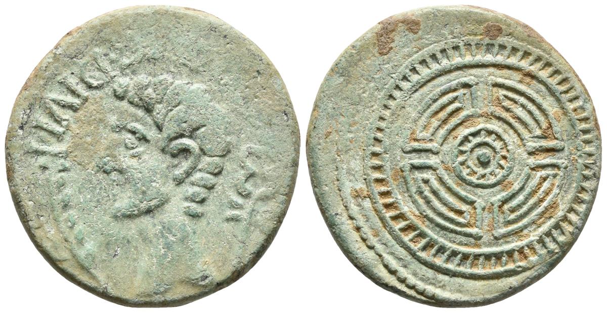 LUCO AUGUSTI. As. Epoca de Augusto. 27 a.C-14 d.C. Lugo. A/ Cabeza desnuda de Augusto a izquierda entre palma y caduceo, IMP AVG DIVI F. R/ Rodela de frente sin borde. FAB-1703. Ae. 12,17g. Preciosa pátina. MBC/MBC+.