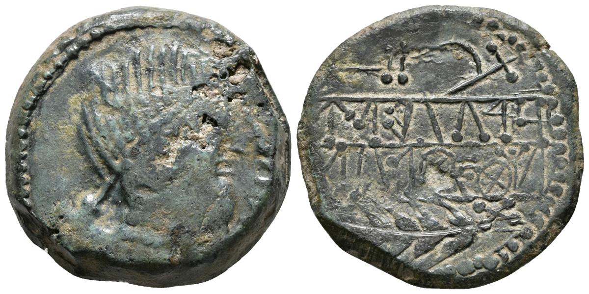 OBULCO. As. 220-20 a.C. Porcuna (Jaén). A/ Cabeza femenina con collar a derecha, delante interna OBVLCO. R/ Arado y espiga a izquierda, entre ellos, en ibérico meridional URKaILTuNESELTuKo, a la derecha de la espiga X. FAB-1791var (letras redondas). Ae. 15,74g. Fallo del metal en anverso. MBC-/MBC+.