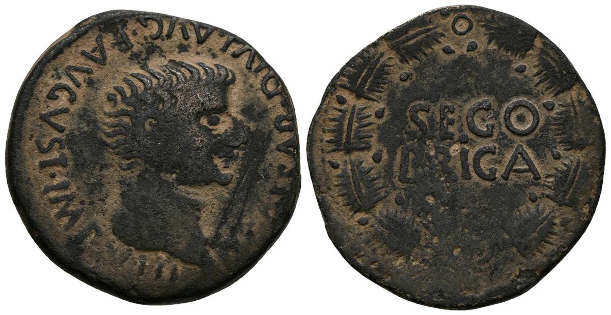 SEGOBRIGA. As. Epoca de Tiberio. 14-36 a.C. Saelices (Cuenca). A/ Cabeza de Tiberio a derecha, alrededor leyenda TI CAESAR DIVI AVG F AVGVST IMP V III. R/ Corona de roble rodeando la leyenda SEGO-BRIGA. FAB-2186. Ae. 10,89g. MBC-/MBC.