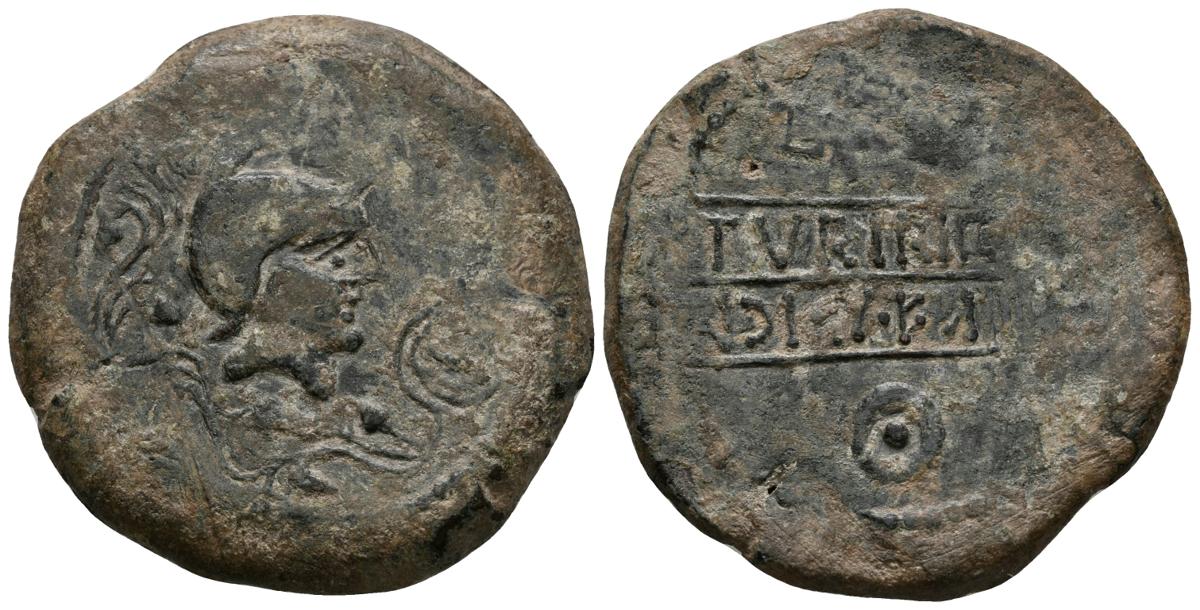 TURRIREGINA. As. 50 a.C. Casas de Reina (Badajoz). A/ Cabeza con casco a derecha, dentro de corona de tallos de vid. R/ Entre falcata y rodela, leyenda latina TVRIRIICINA y leyenda libio-fenicia. FAB-2464. Ae. 19,47g. MBC. Rara.