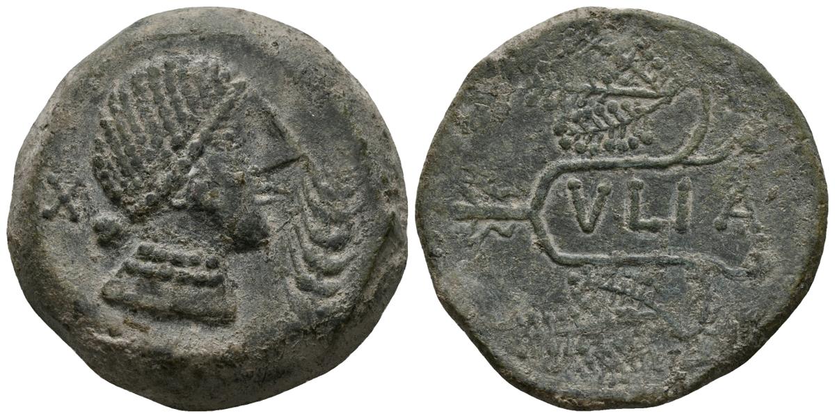 ULIA. As. 50 a.C. Montemayor (Córdoba). A/ Cabeza femenina a derecha, delante palma, sin creciente y detrás letra ibérica Ta. R/ Ramas de vid alrededor de cartela, VLIA. FAB-2494. Ae. 19,68g. MBC+.