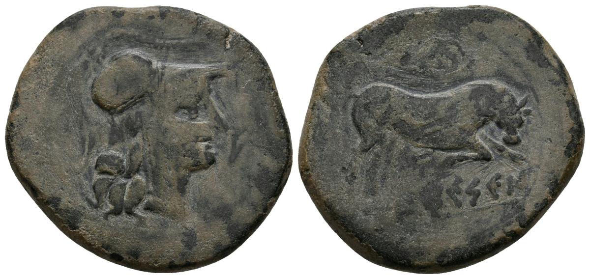 UNTICESCEN. As. 130-90 a.C. San Martín de Ampurias (Gerona). A/ Cabeza de Pala a derecha, delante E. R/ Toro embistiendo a la derecha, debajo UNTiCeSCeN. FAB-1222. Ae. 12g. MBC-.