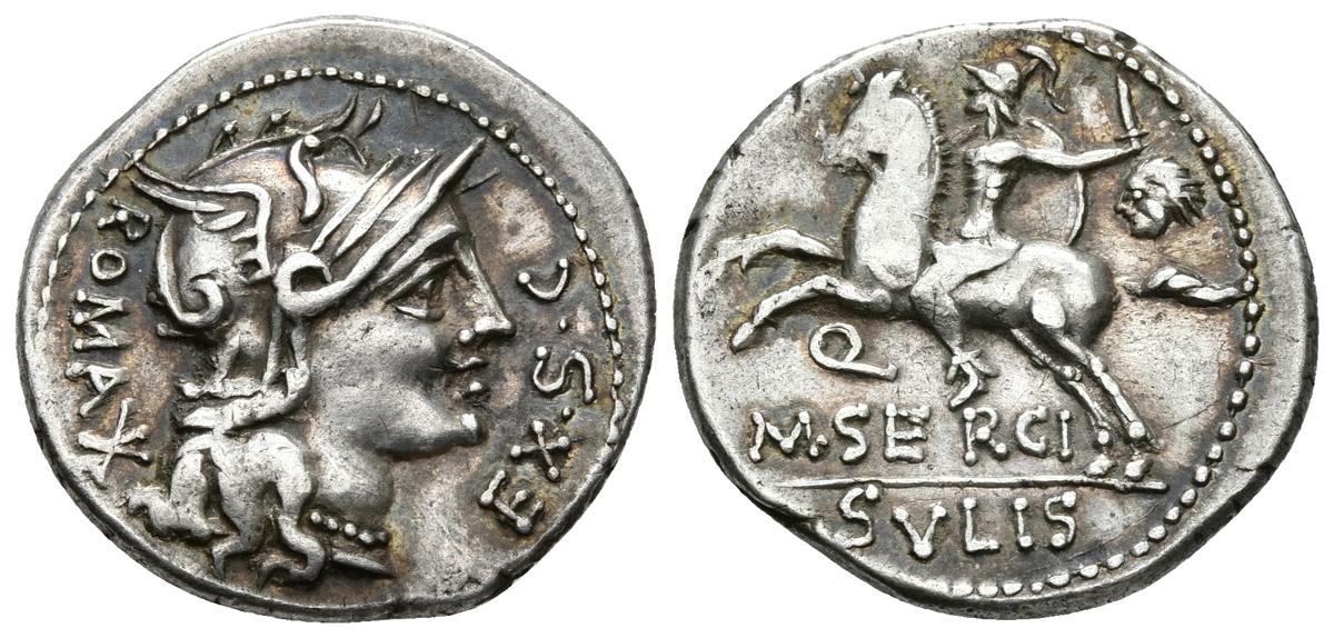 M. SERGIUS SILUS. Denario. 116-115 a.C. Roma. A/ Busto de Roma a derecha, detrás signo de valor ROMA EX S C. R/ Guerrero cabalgando a izquierda con espada, escudo y cabeza cortada, debajo Q. en exergo M SERGI, bajo linea SVLIS. Bab. 1; Craw. 286/1 var; Falta en Seaby y FFC. Ar. 3,92g. Preciosa pátina irisada. EBC-. Muy rara.