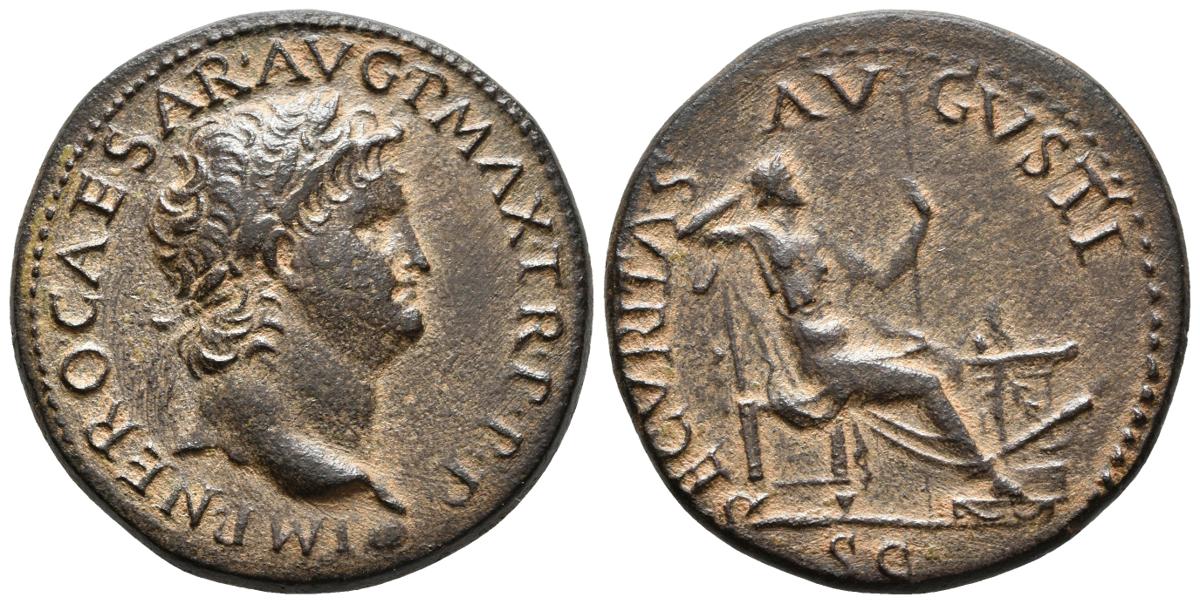 NERON. Dupondio. 67 d.C. Lugdunum (Lyon). A/ Busto laureado a derecha con cuello terminado en globo. IMP NERO CAESAR AVG P MAX TR P P P. R/ Securitas sedente a derecha apoyando su codo derecho sobre el respaldo del trono y cetro con la mano izquierda, delante altar decorado encendido sobre el que se apoya una antorcha. SECVRITAS AVGVSTI, en exergo SC. RIC 596; Lyon 210; WCN 531. Ae. 12,06g. EBC-/MBC+.
