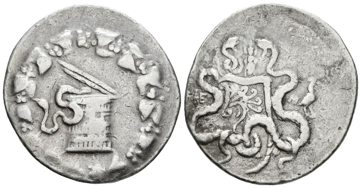 IONIA, Ephesos. Cistophoro. 137-134 a.C. A/ Cista mística con una serpiente, rodeada de corona de yedra. R/ Arco entre serpientes, rodeado de corona de yedra, sobre la corona soldado, a derecha gallo y a izquierda monograma y abeja. Kleiner-Noe Series 38; SNG von Aulock 7835. Ar. 12,49g. MBC-/MBC.