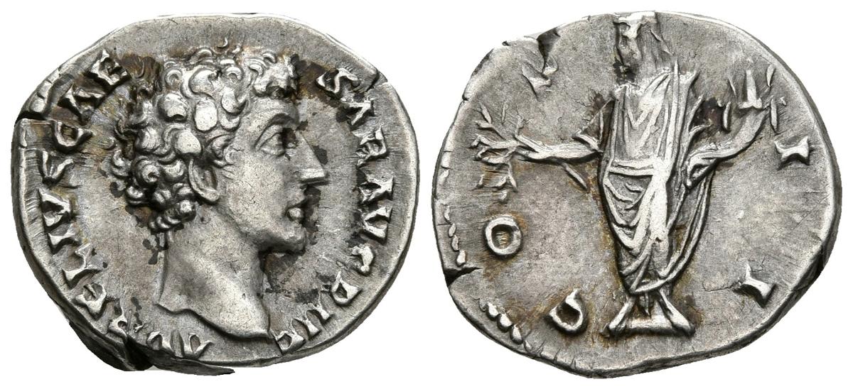 MARCO AURELIO. Denario. 145-147 d.C. Roma. A/ Busto a derecha. AVRELIVS CAESAR AVG PII F. R/ Honos estante a izquierda portando rama y cornucopia. COS II. Cohen 110; RIC 429a. Ar. 3,54g. MBC+.
