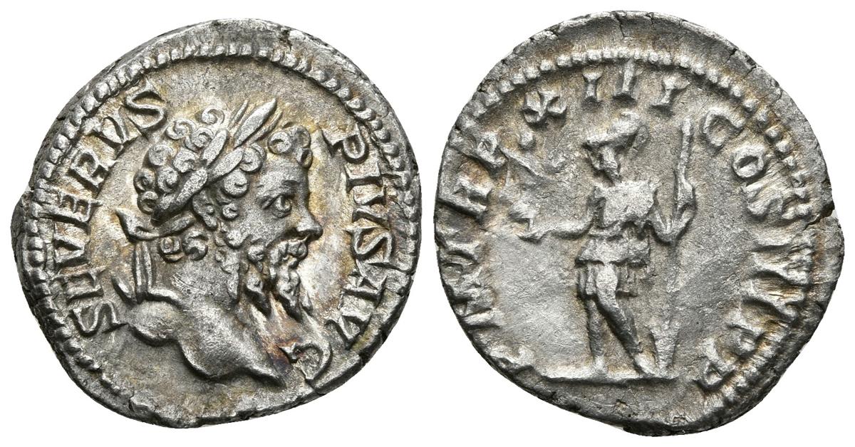 SEPTIMIO SEVERO. Denario. 205 d.C. Roma. A/ Busto laureado a derecha. SEVERVS PIVS AVG. R/ Roma estante a izquierda sosteniendo Victoria y lanza. P M TR P XIII COS III P P. RIC 197; BMC 474; RSC 471. Ar. 3,03g. Suave tono. MBC+/MBC.