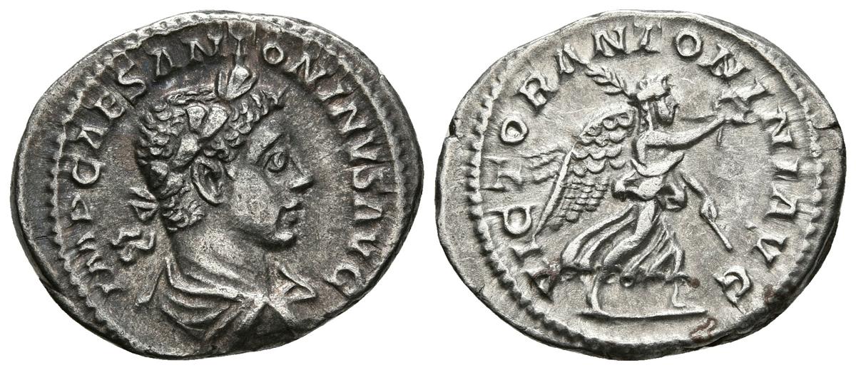 HELIOGABALO. Denario. 219 d.C. Roma. A/ Busto laureado y drapeado con coraza a derecha. IMP CAES M AVR ANTONINVS AVG. R/ Victoria marchando a derecha portando corona y palma. VICTOR ANTONINI AVG. RIC 156; Thirion 56; RSC 289a. Ar. 2,93g. Pátina. MBC+.