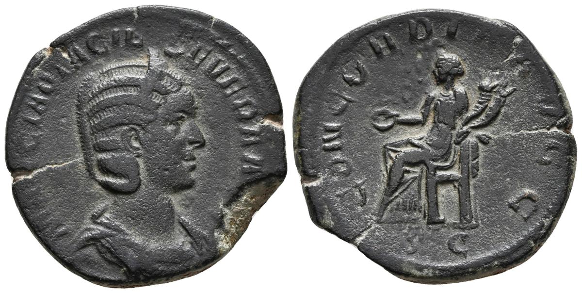 OTACILIA SEVERA. Sestercio. 244-249 d.C. Roma. A/ Busto con diadema y drapeado a derecha. MARCIA OTACILIA SEVERA AVG. R/ Concordia sedente a izquierda portando pátera y doble cornucopia. CONCORDIA AVGG, en exergo SC. RIC 203a (Philip I); C. 10. Ae. 14,62g. MBC/MBC+.
