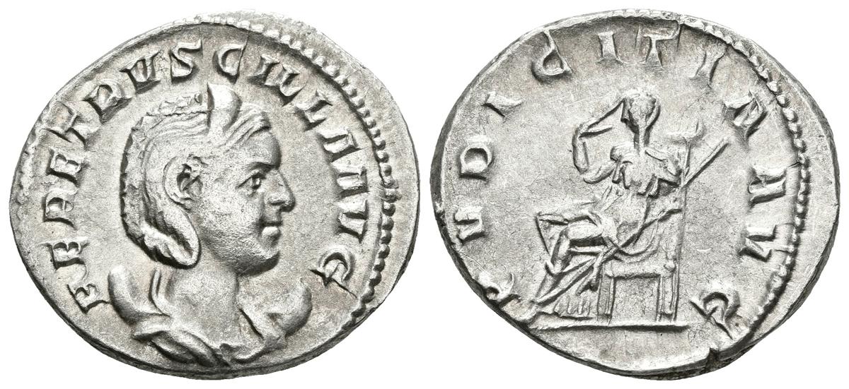 HERENNIA ETRUSCILLA. Antoniniano. 249-251 d.C. Roma. A/ Busto drapeado sobre creciente a derecha. HER ETRVSCILLA AVG. R/ Pudicitia sedente a izquierda portando cetro y sujetando su velo. PVDICITIA AVG. Cohen 19. RIC 59b. Ar. 4,32g. MBC+.