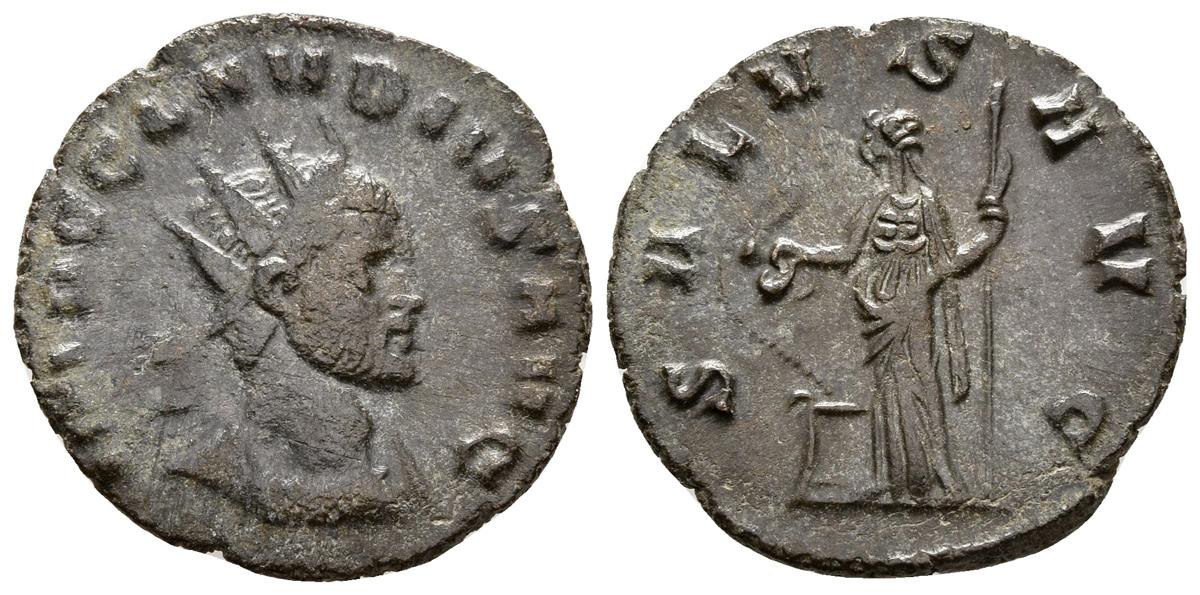 CLAUDIO II. Antoniniano. 268-270 d.C. Antioquía. A/ Busto radiado y con coraza a derecha. IMP C CLAVDIVS AVG. R/ Salus estante a izquierda portando cetro y alimentando a serpiente con pátera sobre altar. SALVS AVG. RIC 98. Ae. 3,16g. MBC-/MBC+.