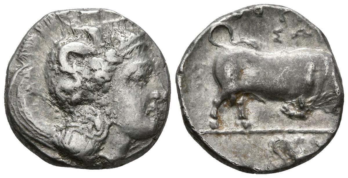 LUCANIA, Thourioi. Estátera. 400-350 a.C. A/ Athenea a derecha con Skylla en el casco. R/ Toro embistiendo a derecha, sobre el monograma y debajo hipocampo. SNG COP No cita; SNG München No cita. SNG ANS 1064. Ar. 7,81g. MBC-/MBC. Escasa.