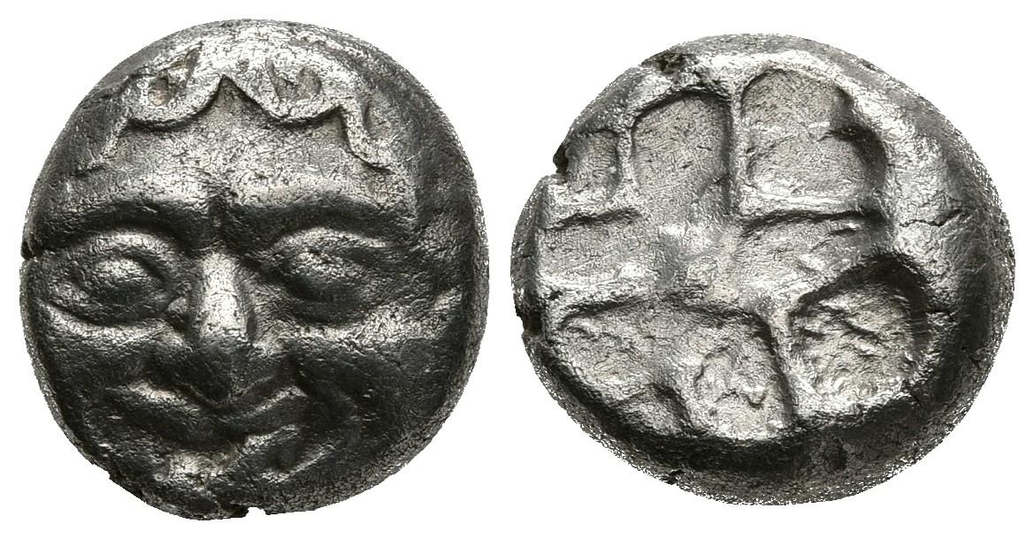 PARION, Mysia. Dracma. 500-475 a.C. A/ Gorgona de frente. R/ Diseño cruciforme incuso. SNG Copenhagen 256. Ar. 3,35g. MBC+.