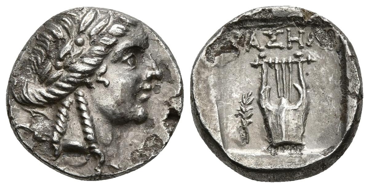 PHASELIS. LYCIA. Dracma. 167-100 a.C. A/ Busto laureado de Apolo a derecha, sobre el hombro arco y carcaj. R/ Kithara con palma a la izquierda dentro de cuadro incuso. Troxell 49.1var; Sear 5340var. Ar. 3,13g. EBC-.