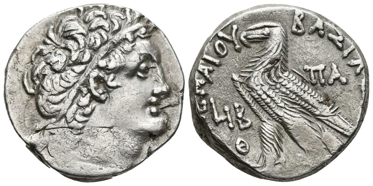 PTOLOMEO X y CLEOPATRA III. Tetradracma. 106-105 a.C. RY=12 de Cleopatra y 9 de Ptolomeo. Alejandría (Egipto). A/ Busto diademado de Ptolomeo I a derecha con égida. R/ Aguila con alas plegadas a izquierda con rayo en sus garras, a su izquierda LIB-0 y a su derecha II A. Svoronos 1728; SNG Copenhagen 359. Ar. 13,28g. MBC+.
