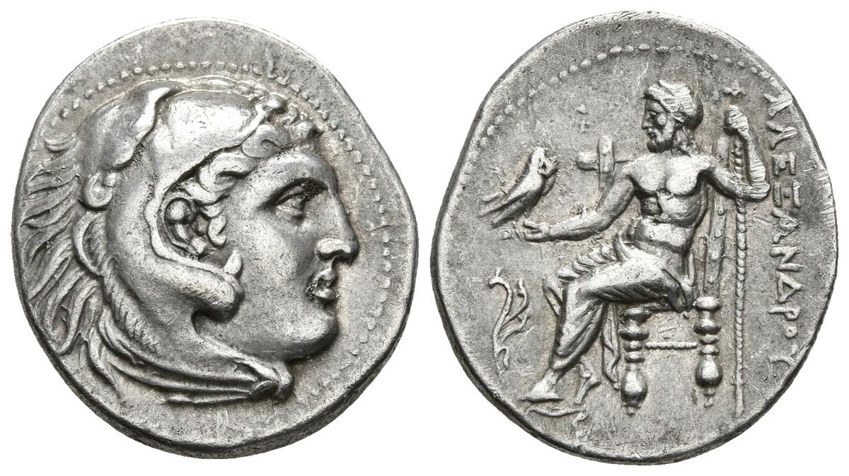 REINO DE MACEDONIA. Alejandro III Magno. Dracma. 336-323 a.C. Ceca incierta. A/ Cabeza de Herakles con piel de león a derecha. R/ Zeus sedente a izquierda portando cetro y águila, delante cabeza de aplustro a izquierda. Price 862A. Ar. 4,31g. Rayas en reverso. MBC+.