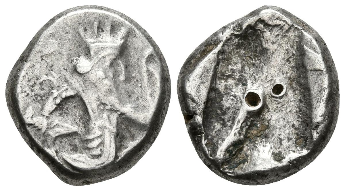 REYES DE PERSIA, Tiempos de Artaxerxes II a Artaxerxes III. Siglos. 375-340 a.C. Sardis. A/ Rey persa vistiendo kidaris y kandys, corriendo arrodillado a derecha, sosteniendo daga y arco. R/ Incuso (Marcas de punzón). Carradice Type IV, Group C; Meadows, Administration 326; BMC Arabia pl. XXVII, 19. Ar. 5,11g. MBC.
