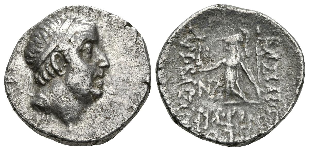REYES DE CAPPADOCIA. Ariobarzanes I Philoromaios. Dracma. 96-63 a.C. A/ Cabeza con diadema de Ariobarzanes a derecha. R/ Athena estante a izquierda con lanza y escudo, esta sostiene Victoria. Monograma a la izquierda MI. Simonetta 44a; HGC 7, 846. Ar. 3,56g. MBC.