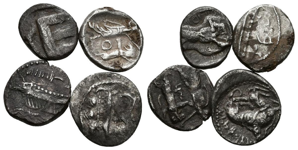 SIDON. Conjunto de 4 monedas. Sakon I. 1/16 Shekel. 425-401 a.C. (2) y Sakon II. 1/16 Shekel. 341-332 a.C. (2). Ar. MBC-/MBC+. A EXAMINAR.