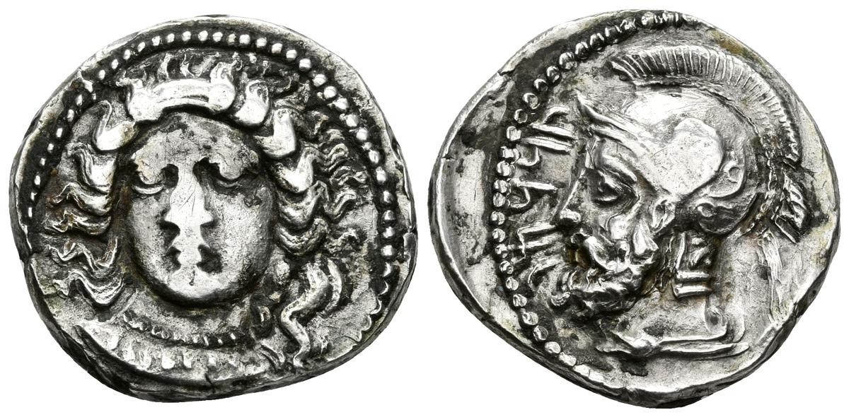 TARSOS. Pharnabazos. 380-373 a.C. A/ Cabeza de Arethusa ligeramente a izquierda con cabello ornamentado con ampyx, aretes y un sólo collar. R/ Cabeza barbada y dreapeada a izquierda con casco y penacho, orejeras recogidas y decorado con motivo floral, delante en arameo FRNBZW. SNG Aulock 5921. Ar. 8,05g. MBC/MBC+.