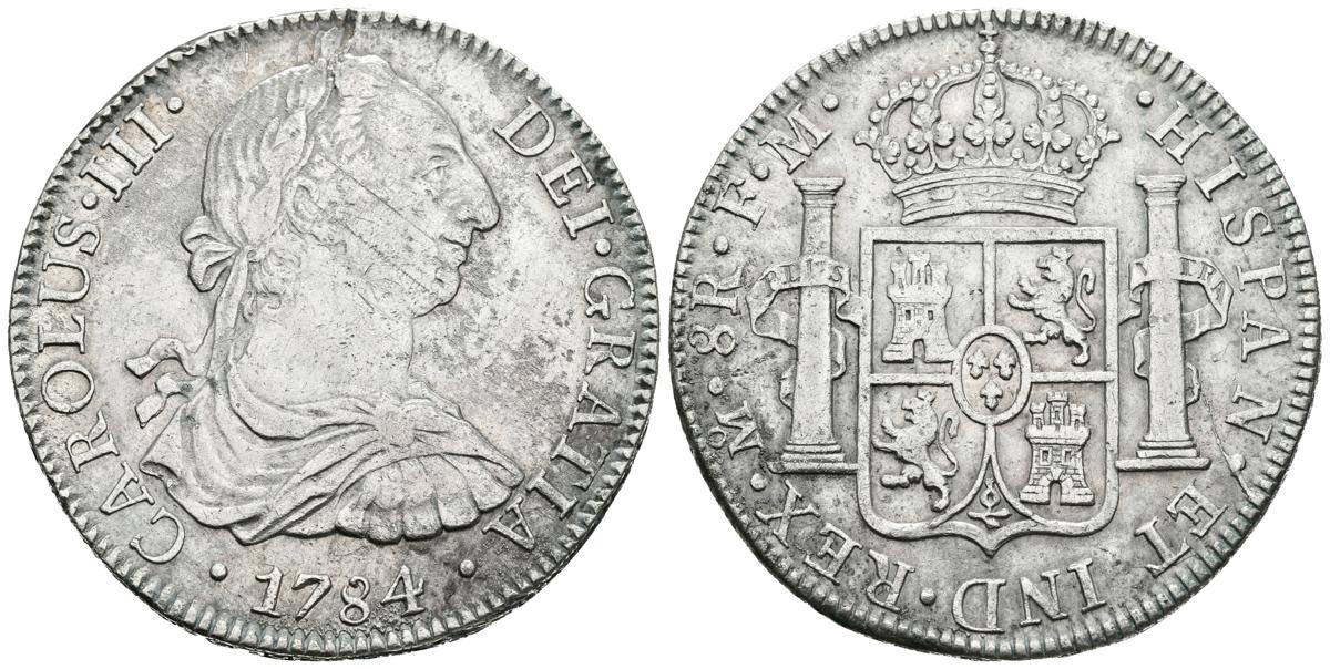 CARLOS III. 8 Reales. 1784. México FM. Cal-936. Ar. 26,68g. Leves erosiones en anverso. MBC+.