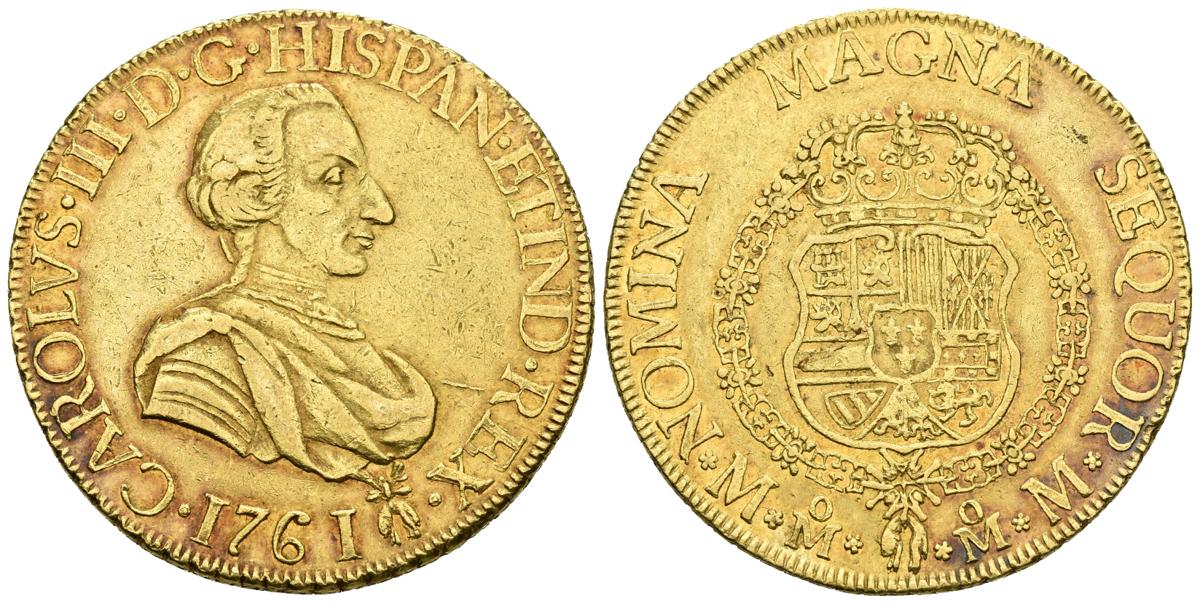 CARLOS III. 8 Escudos. 1761. México MM. Primer busto. Toisón junto a la fecha. Cal-71; Cal.Onza 742. Au. 27,00g. Restos del brillo original en reverso y suave tono. MBC+. Muy rara.