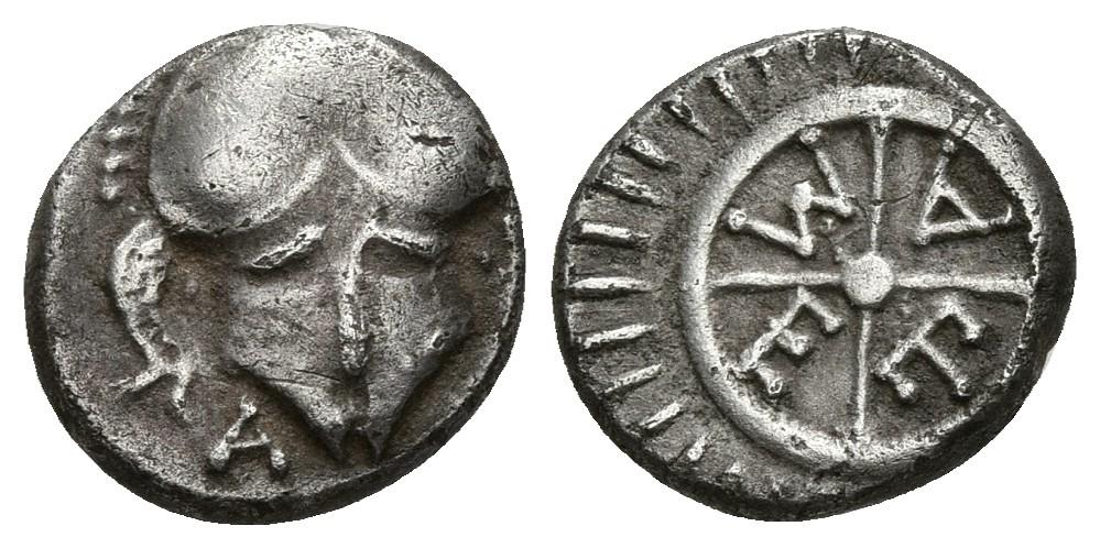 THRACIA, Mesembria. Dióbolo. 450-350 a.C. A/ Casco de frente, a la izquierda letra A. R/ Rueda de cuatro radios, dentro META. SNG BM 270. Ar. 1,20g. MBC. Escasa.