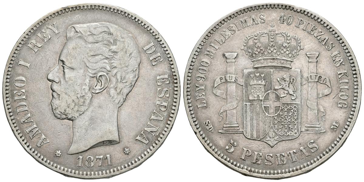 AMADEO I. 5 Pesetas. 1871 *18-71. Madrid SDM. Sin punto después de KILOG. Cal-5var. Ar. 24,95g. MBC+.