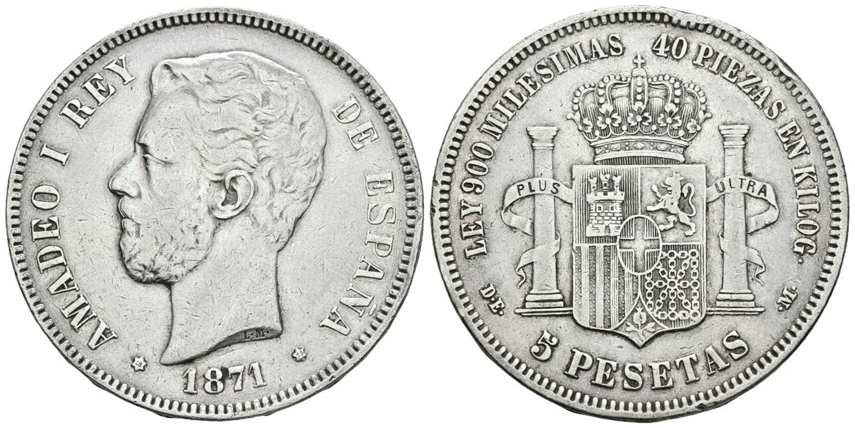 AMADEO I. 5 Pesetas. 1871 *18-73. Madrid DEM. Cal-9. Ar. 24,83g. Golpes en el canto. MBC-. Muy escasa.