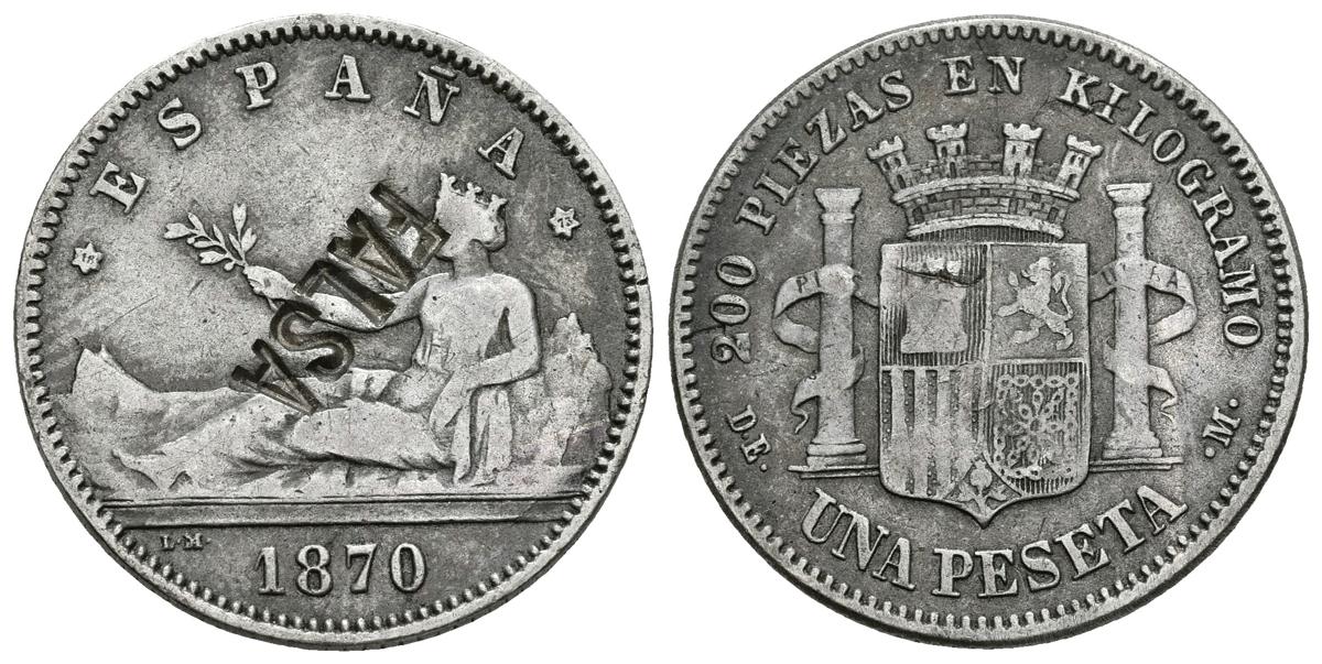 GOBIERNO PROVISIONAL. 1 Peseta. 1870 *18-73. Madrid DEM. Falsa de época, retirada por el banco de España y marcada con FALSA. Cal-17 (Falsa). Metal blanco. 3,52g. MBC+.