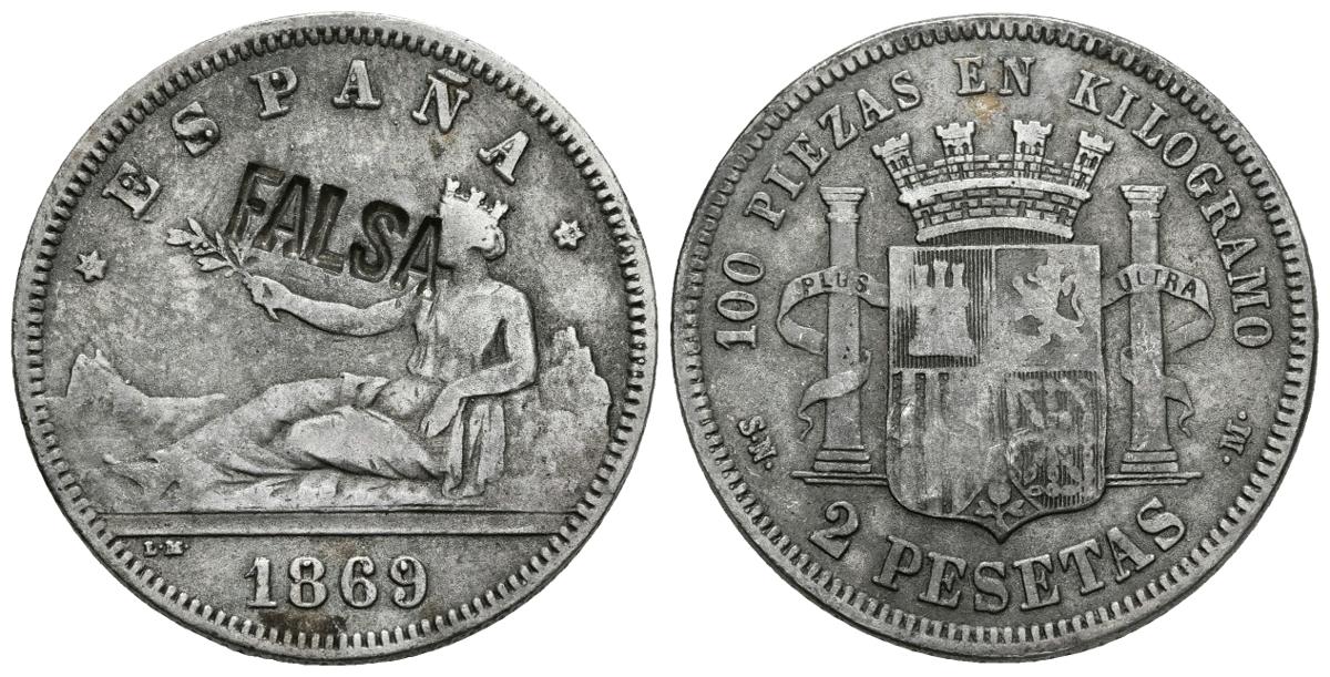 GOBIERNO PROVISIONAL. 2 Pesetas. 1869 *__-68. Madrid SNM. Falsa de época, retirada por el banco de España y marcada con FALSA. Cal-No cita (Falsa). Metal blanco. 7,23g. Fundida. MBC+.